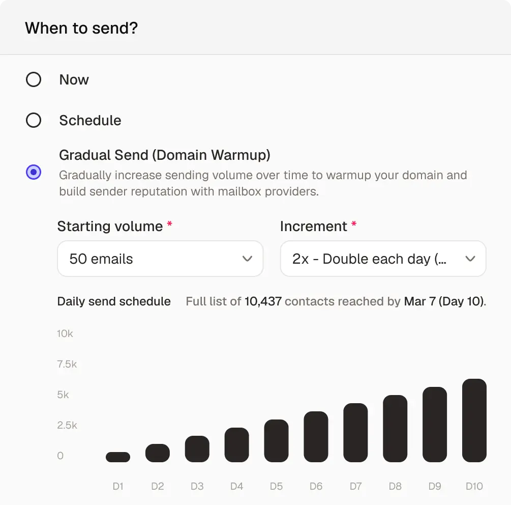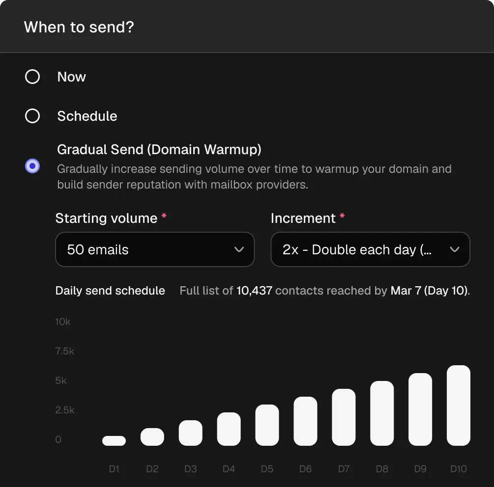 Autosend gives you a warmup schedule that ramps volume at the right pace, so you reach full sending capacity without the false starts.