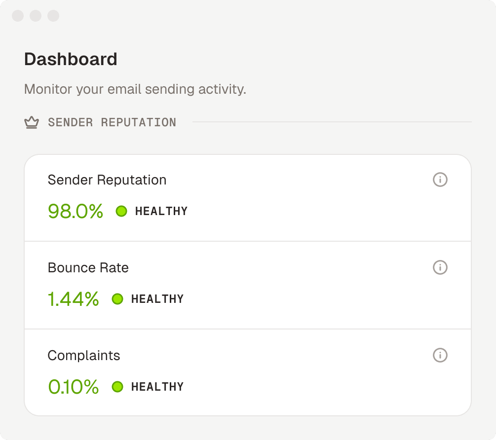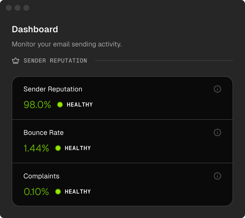 Real-time reputation monitoring, automatic list hygiene, and sending controls. Your emails reach inboxes without you having to think about why they wouldn't.